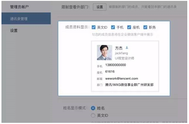 同时,对管理后台也做了大量的优化,包含多种通讯录查看权限设置、自定义成员资料显示、部门支持拖拽排序和成员置顶排序,增加分级管理员权限等,从多维度提升管理效率。